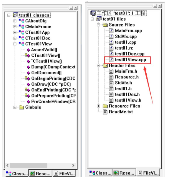 创建完工程,在工作区间主要包括:ClassView(类视图)、ResourceView(资源视图)和FileView(文件视图)。其中类视图主要包含各个类,文件视图包括源文件.cpp和头文件.h。