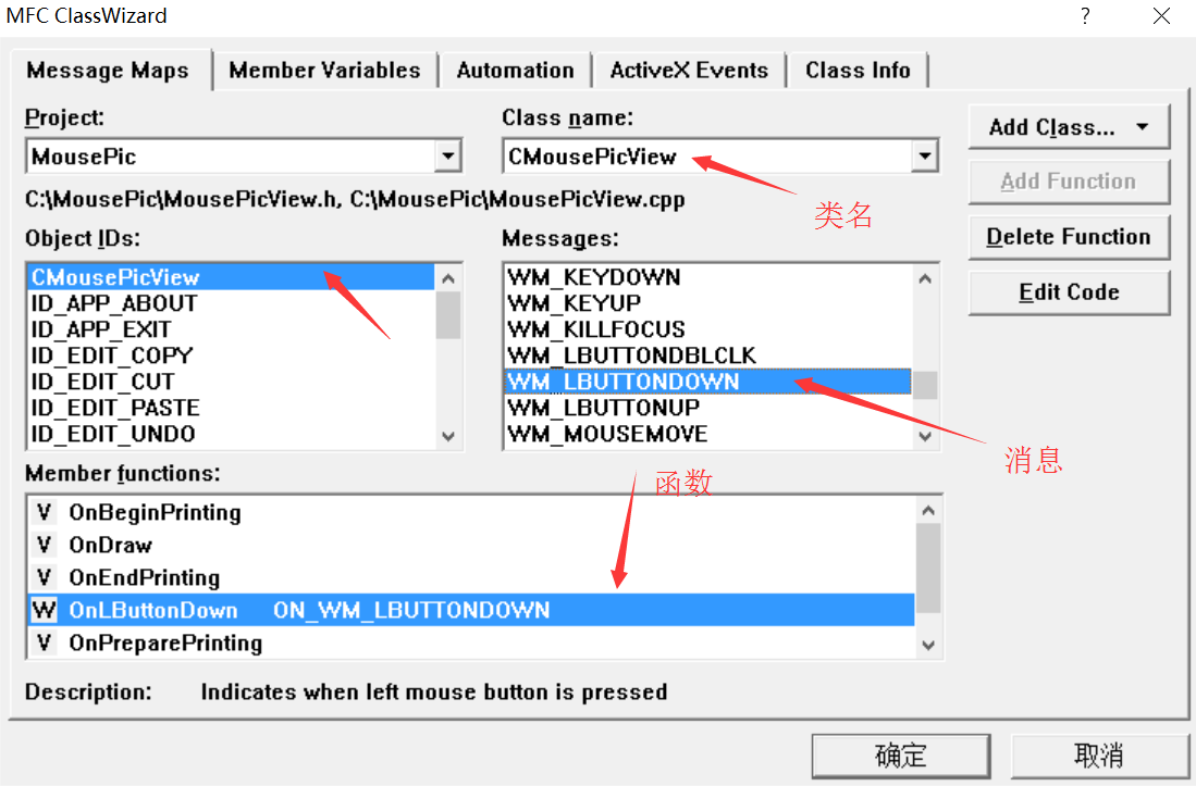 通过同样的方法在"类向导"中实现鼠标左键释放函数,如下图所示。