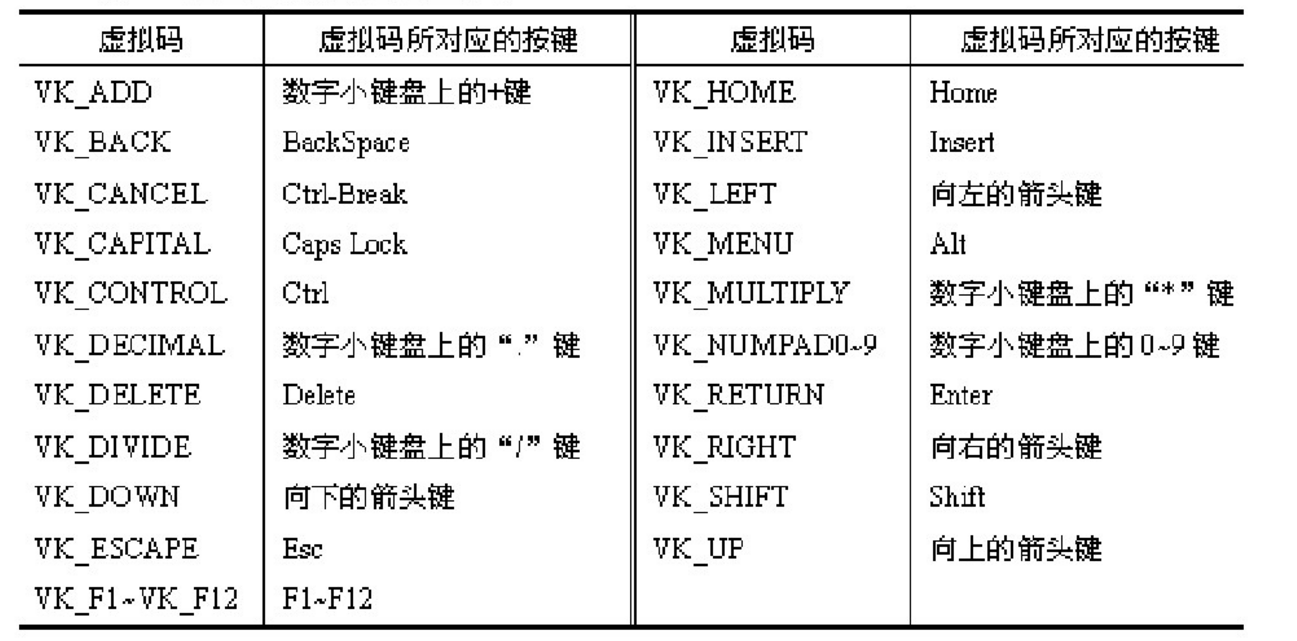 Windows对每个按键定义了与设备无关的编码,这种编码叫做虚拟码。有了这个虚拟码,Windwos程序员可以使用该虚拟码进行编程。其中键盘上部分按键的虚拟码如下图所示: