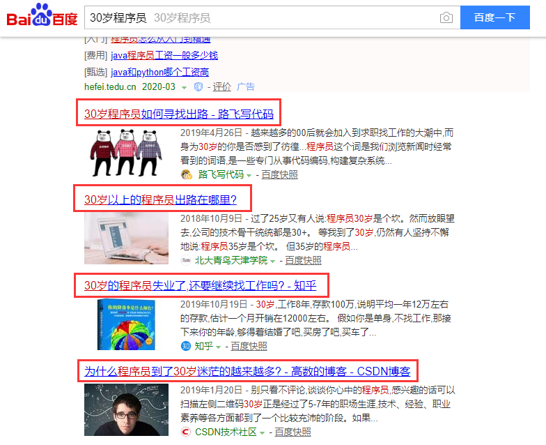百度搜索30岁程序员,会出现诸如:30岁程序员如何寻找出路,30岁程序员失业了,程序员到了30岁迷茫的越来越多,从这些话题看,现在30岁的程序员貌似都有点焦虑。