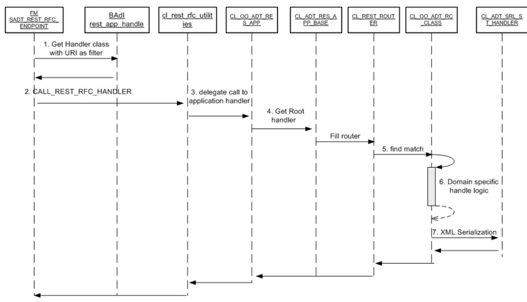 HTTP请求发送到后台之后,上述方法会调用一个统一的入口函数SADT_REST_RFC_ENDPOINT, 该函数和ADT后台框架其他处理逻辑的交互如下图所示: