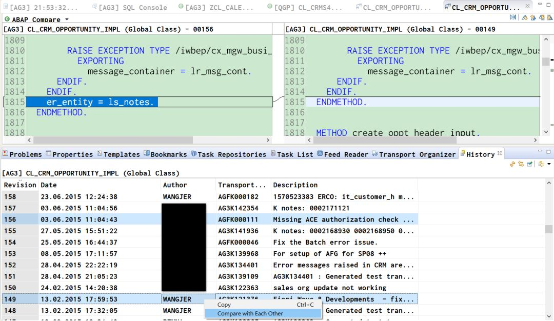 如今在ADT里,ABAP开发人员终于可以像Java程序员一样,享受Eclipse提供的便利的代码版本比较功能了: