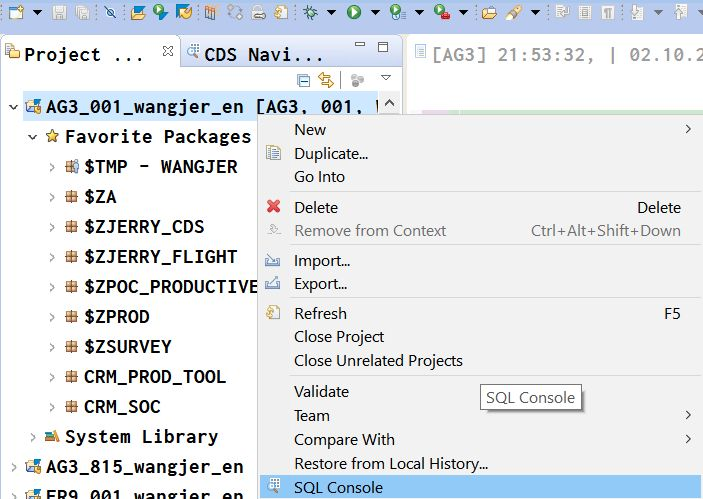 以前在SAP GUI里时,有时出于测试目的想写些简单的SQL语言做些验证,还得创建一个报表然后在报表里书写。在ADT里,直接使用SQL console就可省去不必要的报表创建: