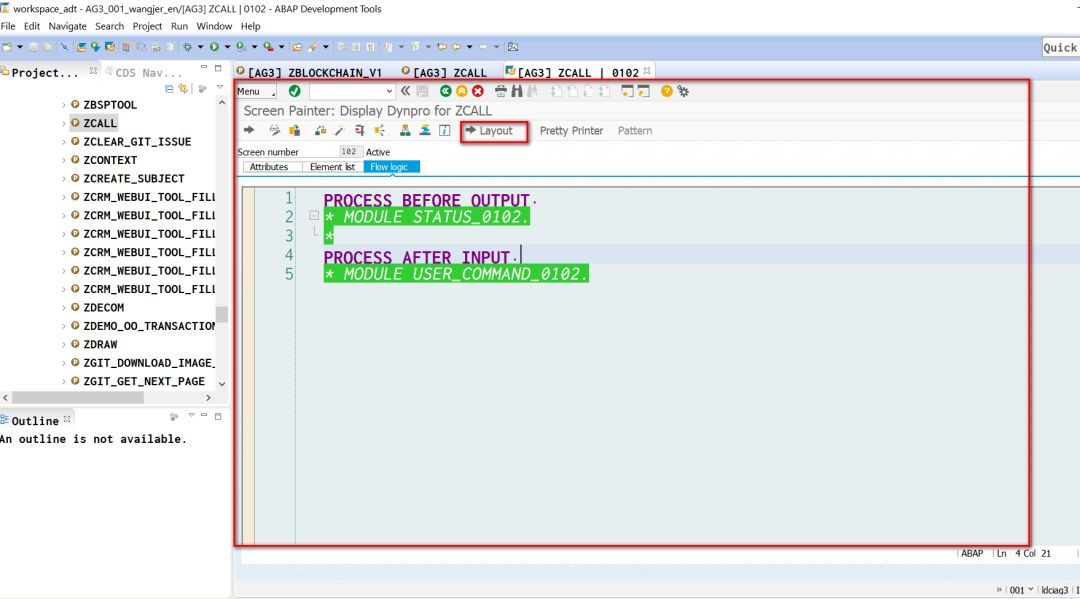 传统Dynpro程序的Screen开发,双击Screen number,就可以通过点击Layout按钮打开Screen Painter,然后进行所见即所得的Screen布局开发: