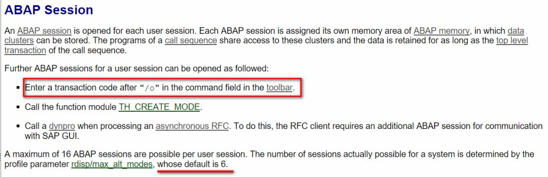 我们每次用SAP GUI登录一个系统,都会产生一个新的User Session,每个User Session里用/o打开一个新的事务码,则是在该User Session里开启了一个新的ABAP Session。一个User Session默认能打开最多6个ABAP Session,可以通过修改系统参数把最大数目扩充为16个。