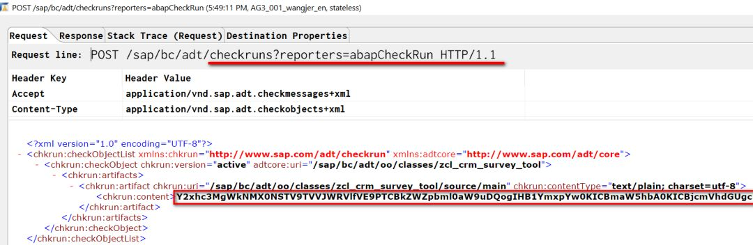 比如在ADT里对ABAP源代码做语法检查,实际上就是把整段代码做一个Base64编码,然后通过HTTP Post发送到后台,由后台执行对应的检查函数,结果通过HTTP响应返回给ADT前端。