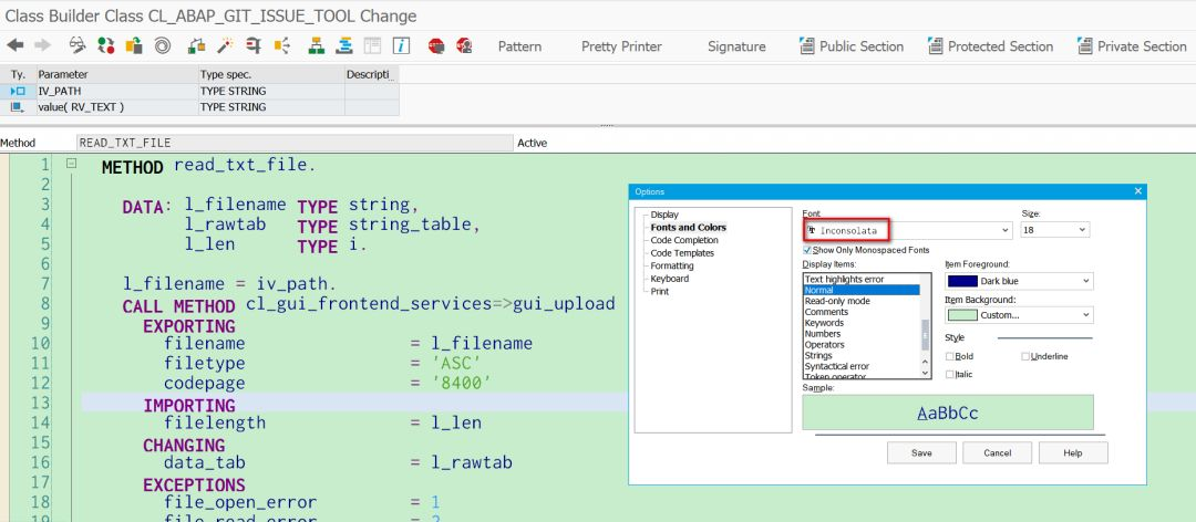 如何才能让您的IDE和其他程序猿相比显得与众不同呢?一个办法是个性化字体和背景色。比如Jerry的SAP GUI的个性化设置是这样的,字体必须用程序猿专用的等宽开源字体Inconsolata,这样显得比较专业。