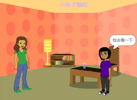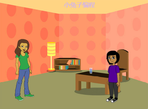 (1)点击绿旗,舞台背景切换为Room 2,Abby出现在舞台左侧,面向右,Dani出现在舞台右侧,面向左;