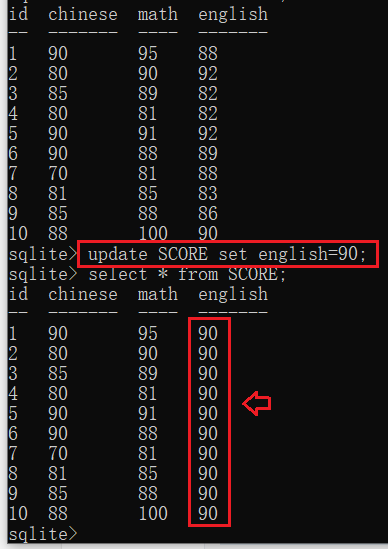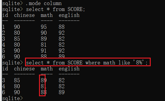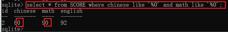 若要显示SCORE中chinese和math成绩以0结尾的记录:
