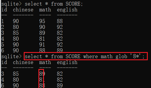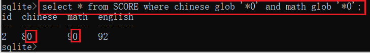 select * from SCORE where chinese glob '*0' and math glob '*0';