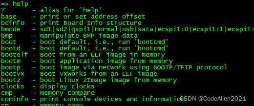 进入 uboot的命令行模式以后输入“ help”或者“?”,然后按下回车即可查看当前 uboot所支持的命令,如图