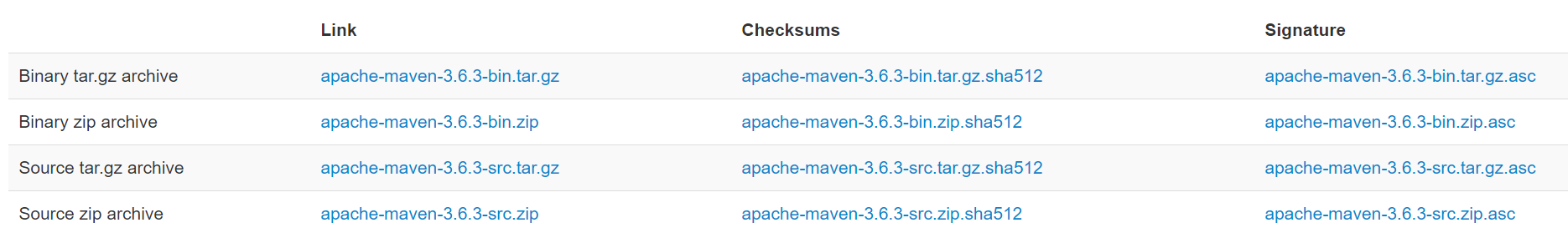 - 下载 Maven,下载地址:https://maven.apache.org/download.cgi。如下图,我们在 Windows 中一般选择第二项进行下载,而在 macOS 或者 Linux 系统中,则选择第一项进行下载。