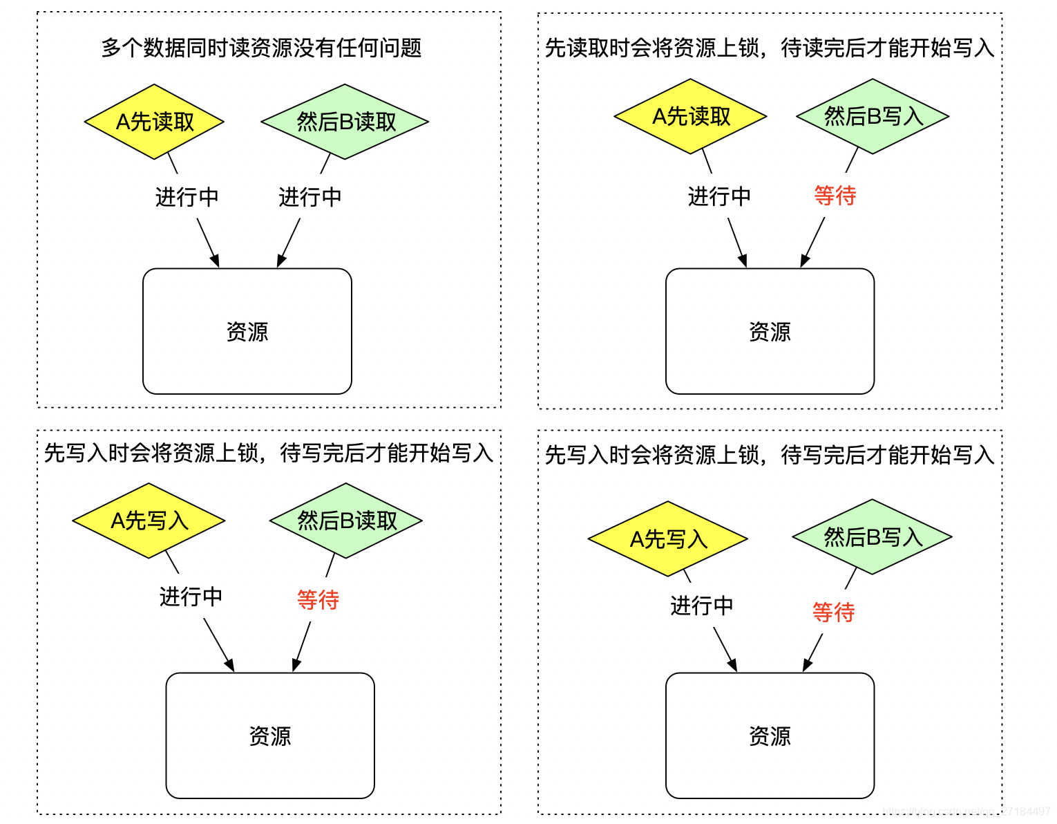 为了保证多个线程同时访问一个资源进行读写操作时不会出现脏读的情况,有必要使用读写锁进行限制,多个线程同时读一个资源时没有任何问题,但是读写同时进行时就会有问题,写写操作也会有问题,为了保证线程安全的情况下,就需要一个读写锁来解决这个问题;