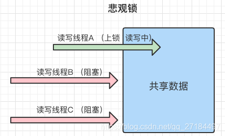 在数据中因为总是假设最坏的情况,所以每次去拿数据的时候都认为别人会修改,所以每次在拿数据的时候都会上锁,这样别人想拿这个数据就会阻塞直到它拿到锁,有任何一线程对数据进行读写操作都会上锁,数据库的行锁、表锁、读锁,写锁都是悲观锁,Java中synchronized锁和ReentrantLock 就是悲观锁思想的实现。