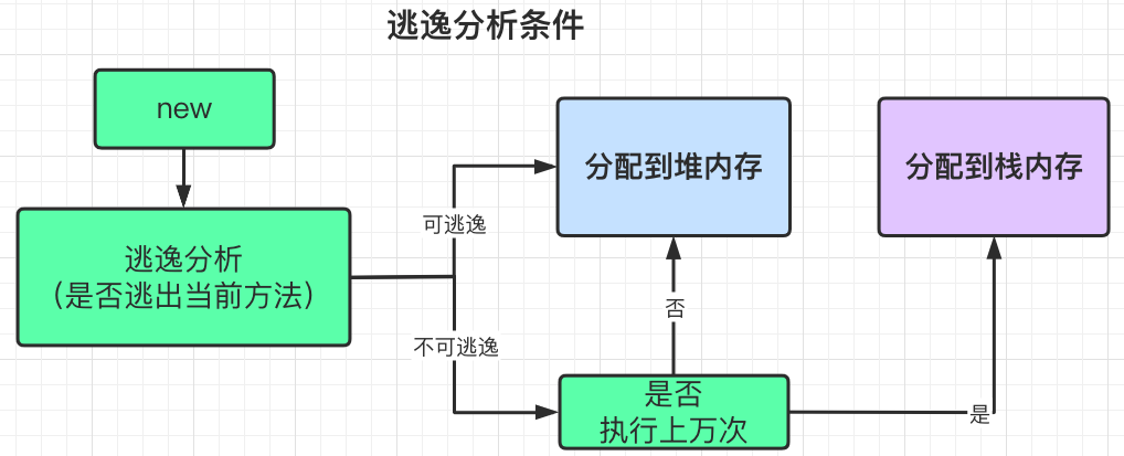 逃逸分析其实很好理解,就是当你在方法里 new 出一个对象之后,这个对象能不能逃出当前的方法,如果对象不能逃出当前方法,就代表着满足了逃逸分析的《不可逃逸》条件;就是说你这个对象除了在当前方法使用,还有没有在别的地方使用,如果有用到,就代表着对象逃出了当前方法(可逃逸),其实逃逸分析的条件有2个: