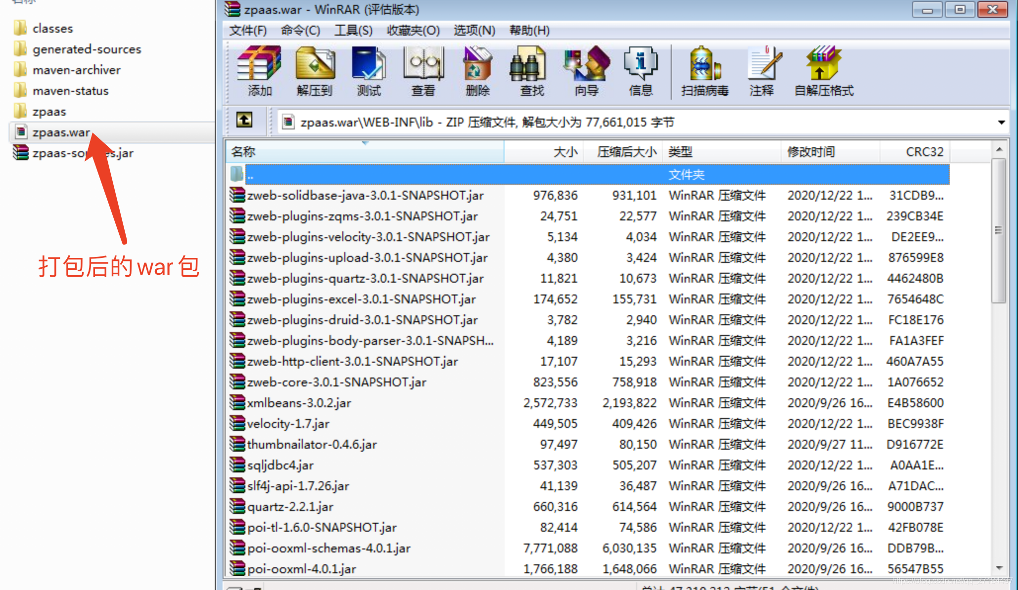 但是不管是mvn install 还是mvn package 打包后,在war包里的 WEB-INF/lib 目录下都没看到这个jar包