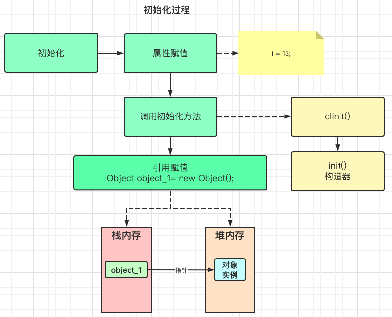 引用赋值是先分配一块栈内存来存放 object_1 并将栈内存的object_1指向堆内存的对象实例,这也是对象创建的最后一步操作;引用赋值完成后,整个对像就创建完成了!