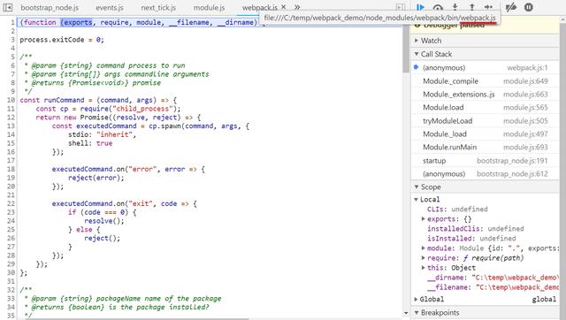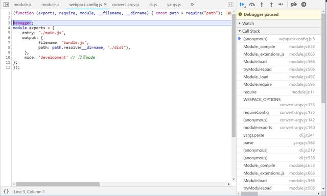 Chrome窗口弹出来了,断点停留在webpack.js第一行处。这个webpack.js就是我们之前命令行里指定的参数:node --inspect-brk ./node_modules/webpack/bin/webpack.js --inline --progress