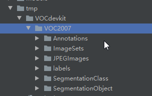 下载后解压,将测试集和训练集合并在一起。在YOLOV5工程下面新建tmp文件夹,然后将voc数据集放到tmp文件夹下面,如图: