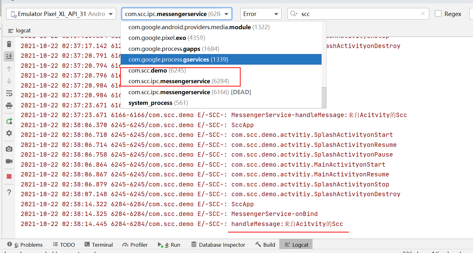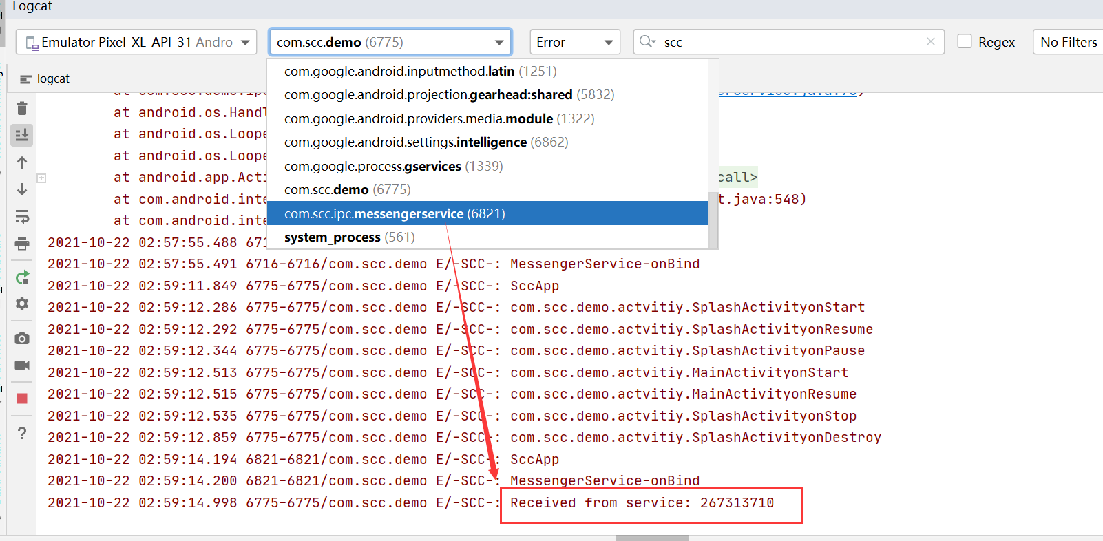 我们在MainActivity 的 Handler.sendMessger()中接收到了来自 MesengerService 的消息 。
