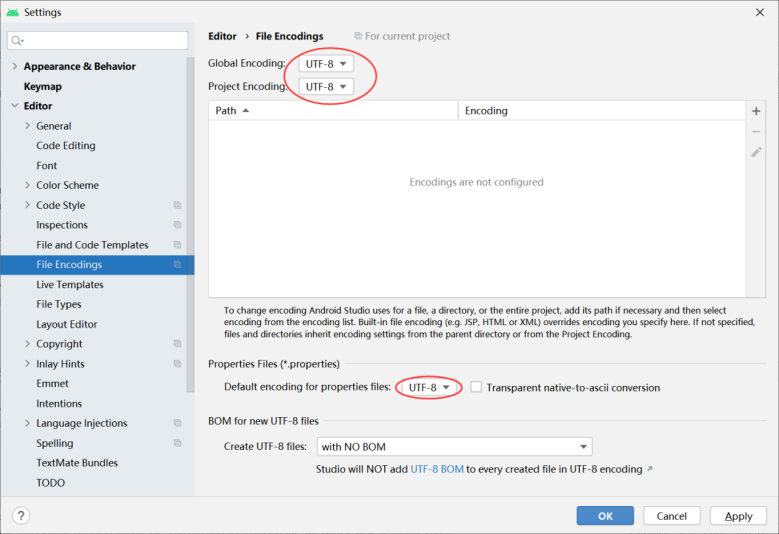 2.打开后输入 「-Dfile.encoding=UTF-8」(前面不要有空格,否则AS打不开),重启Android Studio(FIle选择 Invalidate cache/restart)即可。