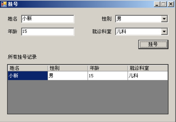- 单击弹出的提示框的“确定”按钮后,在窗体下方的DataGridView控件中显示数据表中的所有挂号记录。25分