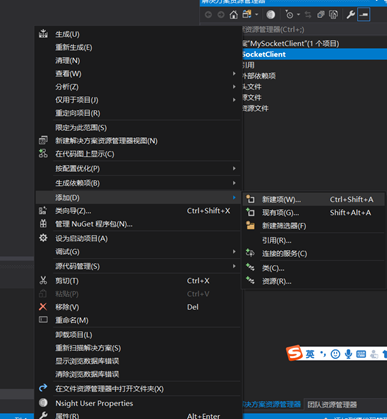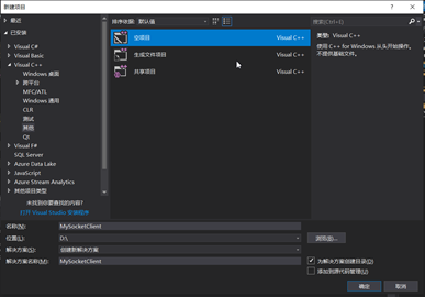 再次选择新建项,选中C++文件,将其改为MySocketClient.c,然后选择添加。