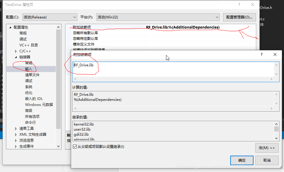 - 将RF_Drive链接到TestDrive。选择输入,然后选择附加依赖项,将RF_Drive.lib添加进去,然后点击确定。