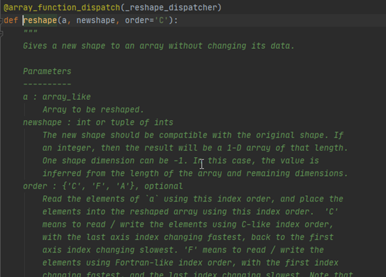 reshape() 函数: 这个方法是在不改变数据内容的情况下,改变一个数组的格式,参数如下图: