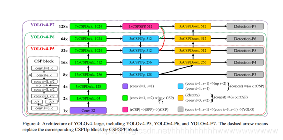 YOLOv4-large是专为云端GPU而设计的一种架构,主要目的在于获得更好的目标检测精度。作者基于前述分析设计了一个全尺寸的YOLOv4-P5并扩展得到了YOLOv4-P6和YOLOv4-P7。其对应的网络结构示意图见下图。