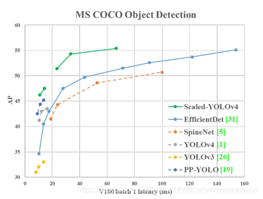 CSPDarknet53的深度、瓶颈比、龄期间宽度生长比分别为65、1和2。因此,我们开发了基于YOLOv4的模型缩放技术,提出了scale -YOLOv4。提出的缩放yolov4具有出色的性能,如下图所示: