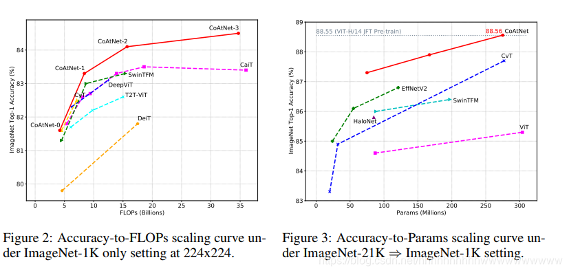 最终赶上了两个具有更多 MBConv 阶段的变体,表明 Transformer 块的容量优势。 另一方面,C-C-T-T 和 C-T-T-T 明显优于