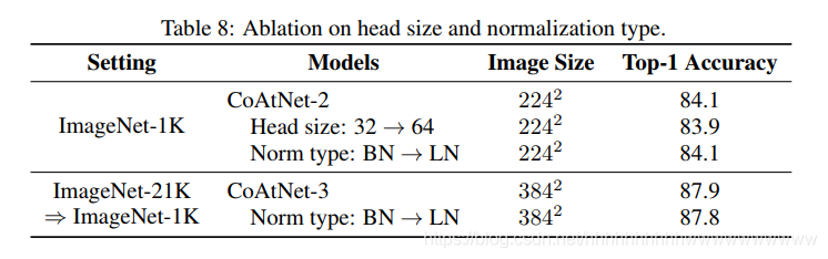 最后,我们研究了模型细节的两种选择,即每个注意力(默认为 32)头部的维度以及 MBConv 块中使用的归一化类型(默认为 BatchNorm)。 从表 8 中,我们可以看到将头部大小从 32 增加到 64 会略微影响性能,尽管它实际上可以显着提高 TPU 速度。 在实践中,这将是一种可以做出的质量与速度的权衡。 另一方面,BatchNorm 和 LayerNorm 的性能几乎相同,而 BatchNorm 在 TPU 上快 10 - 20%,具体取决于每核批量大小。