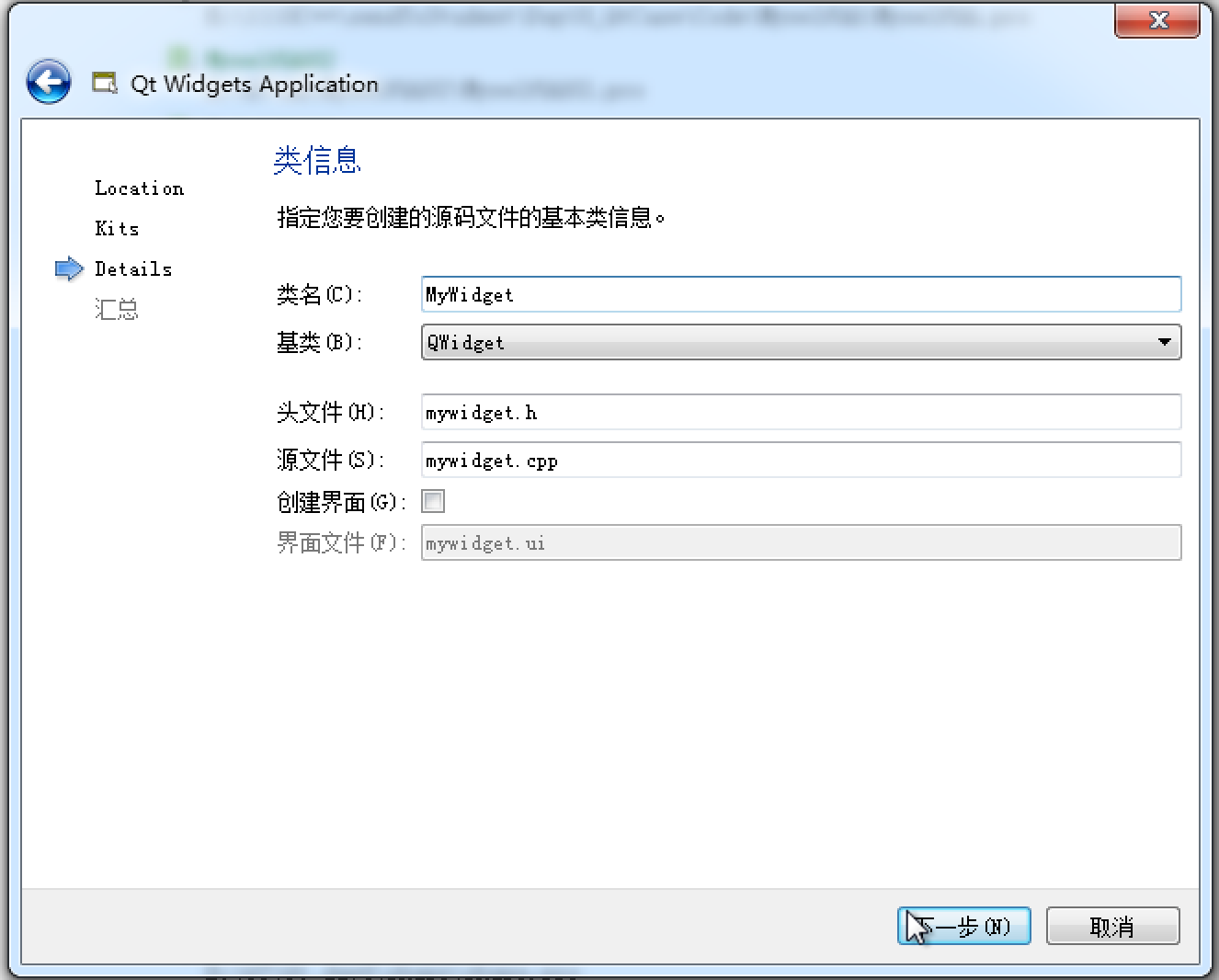 向导会默认添加一个继承自CMainWindow的类,可以在此修改类的名字和基类。默认的基类有QMainWindow、QWidget以及QDialog三个,我们可以选择QWidget(类似于空窗口),这里我们可以先创建一个不带UI的界面,继续下一步