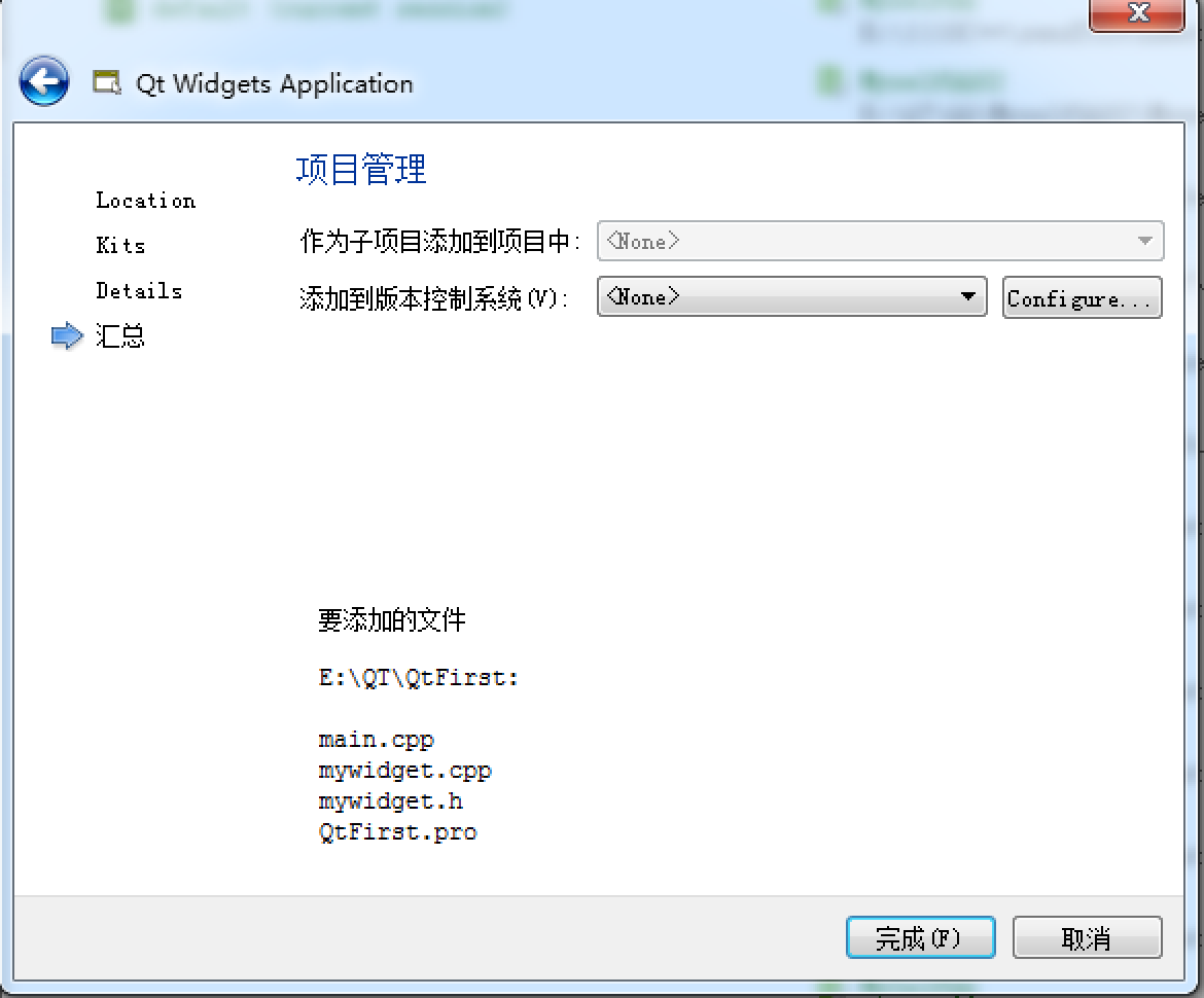 系统会默认给我们添加main.cpp、mywidget.cpp、 mywidget.h和一个.pro项目文件,点击完成,即可创建出一个Qt桌面程序。