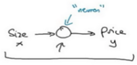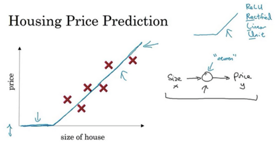作为一个神经网络,这几乎可能是最简单的神经网络。我们把房屋的面积作为神经网络的输入(我们称之为x ),通过一个节点(一个小圆圈),最终输出了价格(我们用y 表示)。其实这个小圆圈就是一个单独的神经元。接着你的网络实现了左边这个函数的功能。