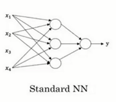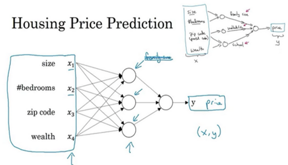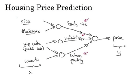 在图上每一个画的小圆圈都可以是ReLU的一部分,也就是指修正线性单元,或者其它稍微非线性的函数。基于房屋面积和卧室数量,可以估算家庭人口,基于邮编,可以估测步行化程度或者学校的质量。最后你可能会这样想,这些决定人们乐意花费多少钱。