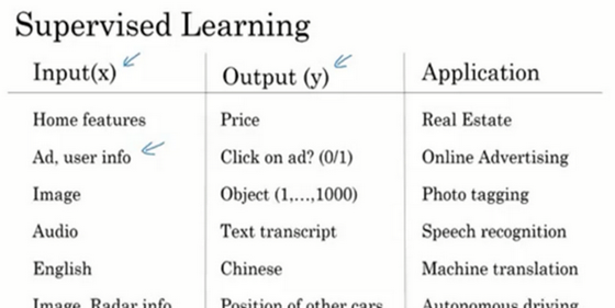 在监督学习中你有一些输入x ,你想学习到一个函数来映射到一些输出y ,比如我们之前提到的房价预测的例子,你只要输入有关房屋的一些特征,试着去输出或者估计价格y 。我们举一些其它的例子,来说明神经网络已经被高效应用到其它地方。