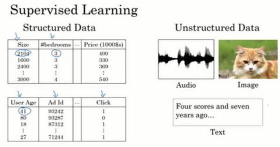 你可能也听说过机器学习对于结构化数据和非结构化数据的应用,结构化数据意味着数据的基本数据库。例如在房价预测中,你可能有一个数据库,有专门的几列数据告诉你卧室的大小和数量,这就是结构化数据。或预测用户是否会点击广告,你可能会得到关于用户的信息,比如年龄以及关于广告的一些信息,然后对你的预测分类标注,这就是结构化数据,意思是每个特征,比如说房屋大小卧室数量,或者是一个用户的年龄,都有一个很好的定义。