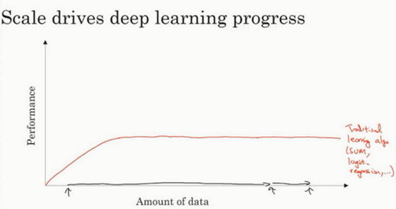 在过去的几年里,很多人都问我为什么深度学习能够如此有效。当我回答这个问题时,我通常给他们画个图,在水平轴上画一个形状,在此绘制出所有任务的数据量,而在垂直轴上,画出机器学习算法的性能。比如说准确率体现在垃圾邮件过滤或者广告点击预测,或者是神经网络在自动驾驶汽车时判断位置的准确性,根据图像可以发现,如果你把一个传统机器学习算法的性能画出来,作为数据量的一个函数,你可能得到一个弯曲的线,就像图中这样,它的性能一开始在增加更多数据时会上升,但是一段变化后它的性能就会像一个高原一样。假设你的水平轴拉的很长很长,它们不知道如何处理规模巨大的数据,而过去十年的社会里,我们遇到的很多问题只有相对较少的数据量。
