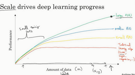多亏数字化社会的来临,现在的数据量都非常巨大,我们花了很多时间活动在这些数字的领域,比如在电脑网站上、在手机软件上以及其它数字化的服务,它们都能创建数据,同时便宜的相机被配置到移动电话,还有加速仪及各类各样的传感器,同时在物联网领域我们也收集到了越来越多的数据。仅仅在过去的20年里对于很多应用,我们便收集到了大量的数据,远超过机器学习算法能够高效发挥它们优势的规模。