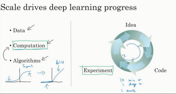 如果你无法理解刚才我说的某个细节,也不需要担心,可以知道的一个使用sigmoid函数和机器学习问题是,在这个区域,也就是这个sigmoid函数的梯度会接近零,所以学习的速度会变得非常缓慢,因为当你实现梯度下降以及梯度接近零的时候,参数会更新的很慢,所以学习的速率也会变的很慢,而通过改变这个被叫做激活函数的东西,神经网络换用这一个函数,叫做ReLU的函数(修正线性单元),ReLU它的梯度对于所有输入的负值都是零,因此梯度更加不会趋向逐渐减少到零。而这里的梯度,这条线的斜率在这左边是零,仅仅通过将Sigmod函数转换成ReLU函数,便能够使得一个叫做梯度下降(gradient descent)的算法运行的更快,这就是一个或许相对比较简单的算法创新的例子。但是根本上算法创新所带来的影响,实际上是对计算带来的优化,所以有很多像这样的例子,我们通过改变算法,使得代码运行的更快,这也使得我们能够训练规模更大的神经网络,或者是多端口的网络。即使我们从所有的数据中拥有了大规模的神经网络,快速计算显得更加重要的另一个原因是,训练你的神经网络的过程,很多时候是凭借直觉的,往往你对神经网络架构有了一个想法,于是你尝试写代码实现你的想法,然后让你运行一个试验环境来告诉你,你的神经网络效果有多好,通过参考这个结果再返回去修改你的神经网络里面的一些细节,然后你不断的重复上面的操作,当你的神经网络需要很长时间去训练,需要很长时间重复这一循环,在这里就有很大的区别,根据你的生产效率去构建更高效的神经网络。当你能够有一个想法,试一试,看效果如何。在10分钟内,或者也许要花上一整天,如果你训练你的神经网络用了一个月的时间,有时候发生这样的事情,也是值得的,因为你很快得到了一个结果。在10分钟内或者一天内,你应该尝试更多的想法,那极有可能使得你的神经网络在你的应用方面工作的更好、更快的计算,在提高速度方面真的有帮助,那样你就能更快地得到你的实验结果。这也同时帮助了神经网络的实验人员和有关项目的研究人员在深度学习的工作中迭代的更快,也能够更快的改进你的想法,所有这些都使得整个深度学习的研究社群变的如此繁荣,包括令人难以置信地发明新的算法和取得不间断的进步,这些都是开拓者在做的事情,这些力量使得深度学习不断壮大。