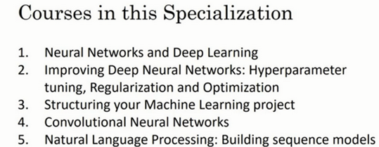 在第一个视频已经提到,这个专项有五门课程,目前正处于第一门课:神经网络与深度学习。在这门课中将教会你最重要的基础知识。当学习到第一门课末尾,你将学到如何建立一个深度神经网络并且使之奏效。