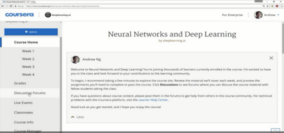 在cousera的这一系列也叫做专项课程中,在第一门课中(神经网络和深度学习),你将学习神经网络的基础,你将学习神经网络和深度学习,这门课将持续四周,专项课程中的每门课将持续2至4周。