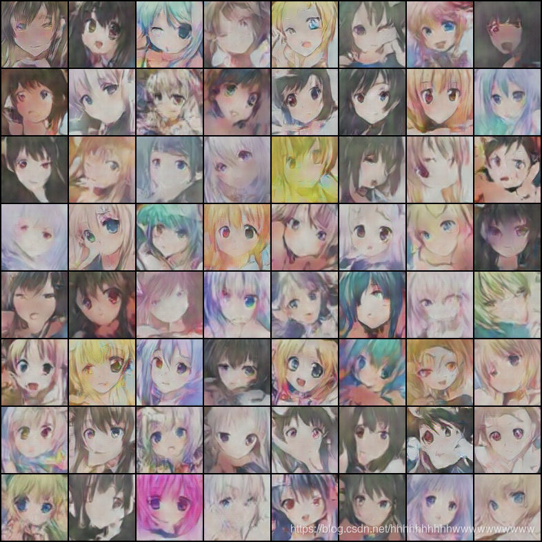 @mattya,利用DCGAN从20万张动漫头像中学习,最终能够利用程序自动生成动漫头像,生成的图片效果如下图所示。源程序是利用Chainer框架实现的,本节我们尝试利用PyTorch实现。