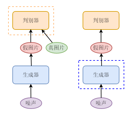 训练生成器时,无须调整判别器的参数;训练判别器时,无须调整生成器的参数。
