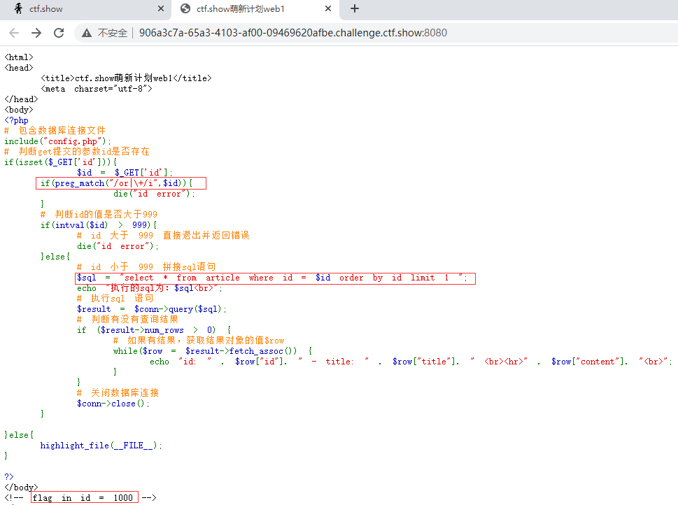 页面中给出了源码,并提示我们 id=1000时,即可获取flag
