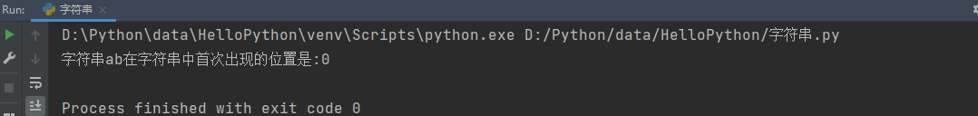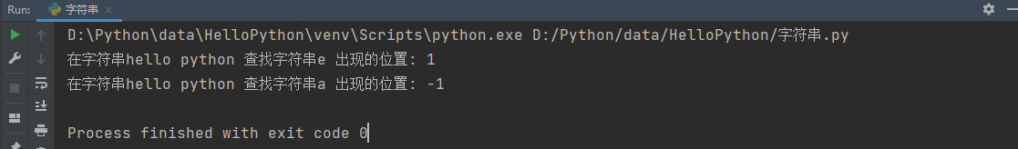 print('在字符串hello python 查找字符串a 出现的位置: %s' % text.find('a'))
