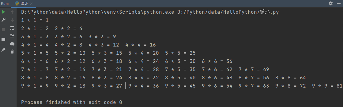 print('%d * %d = %d ' % (row, col, row * col), end='')