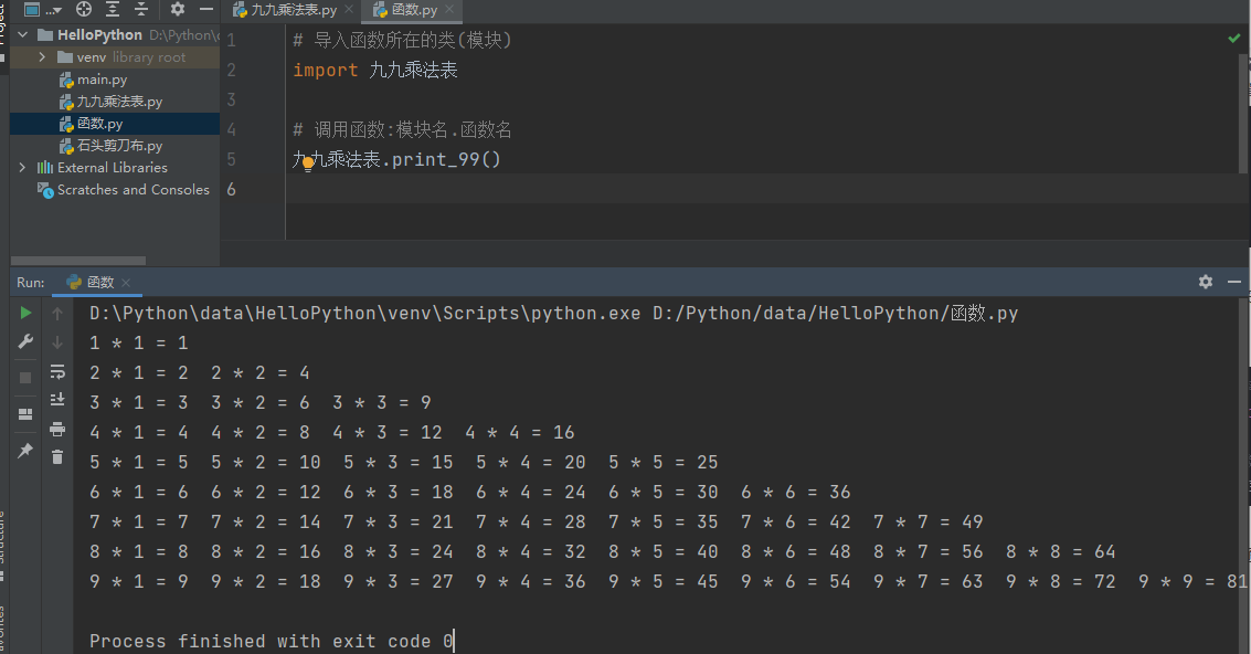 运行 函数.py文件, 即可调函数中的代码, 从而打印出九九乘法表的内容